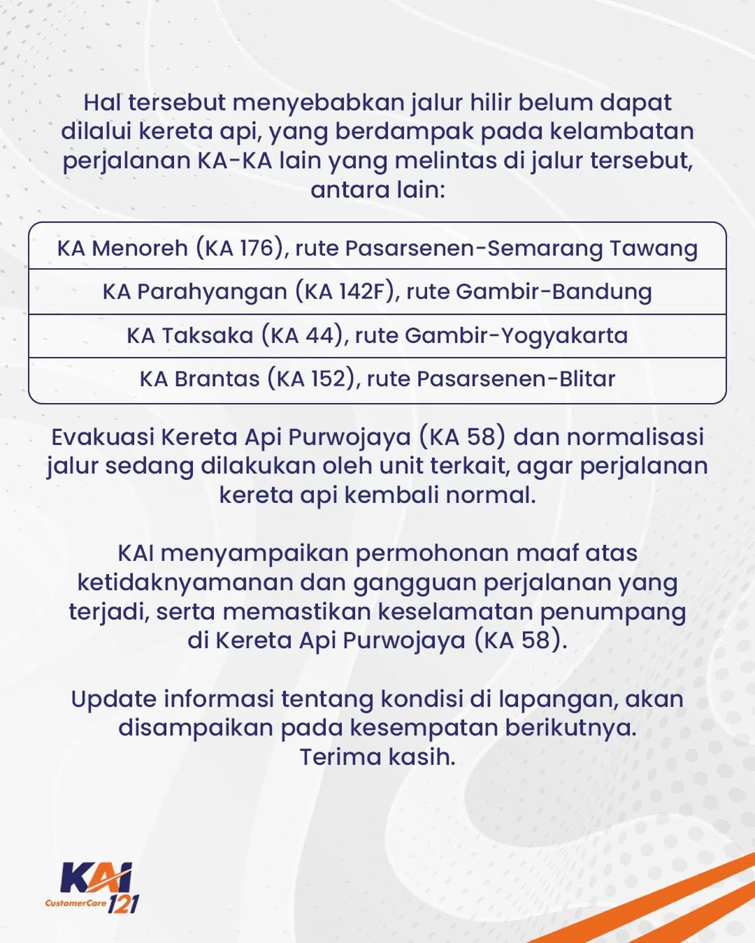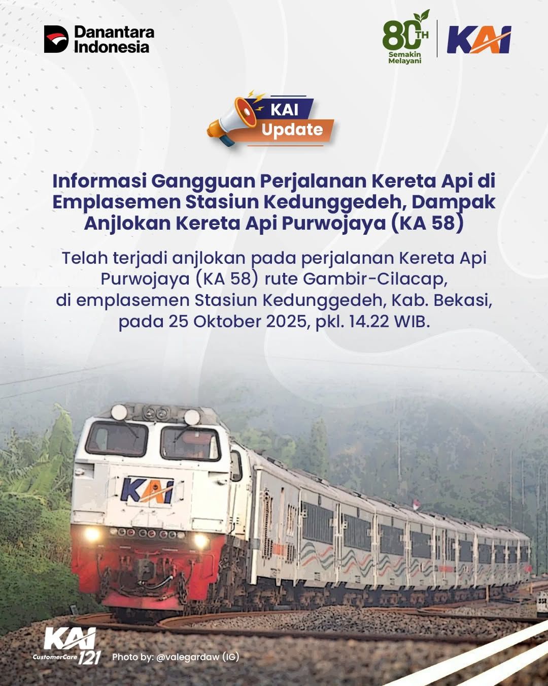 MADIUN, lintas– PT Kereta Api Indonesia (Persero) Daerah Operasi 7 (Daop 7) Madiun menyampaikan permohonan maaf kepada seluruh pelanggan atas keterlambatan perjalanan beberapa Kereta Api yang terjadi akibat gangguan operasional pada KA Purwojaya (KA 58F) relasi Gambir–Cilacap di emplasemen Stasiun Kedunggedeh, Sabtu (25/10/2025) sore.